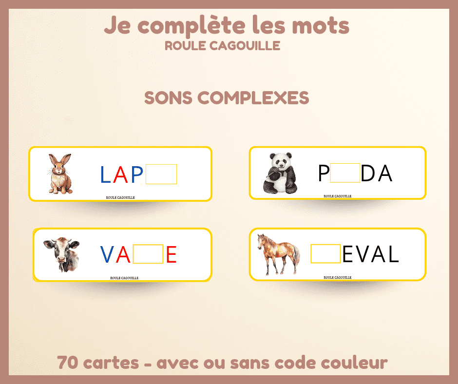 Ce fichier PDF contient 70 cartes à compléter, conçues pour aider l’enfant à associer les sons complexes aux bonnes écritures, en retrouvant le ou les éléments manquants dans un mot.