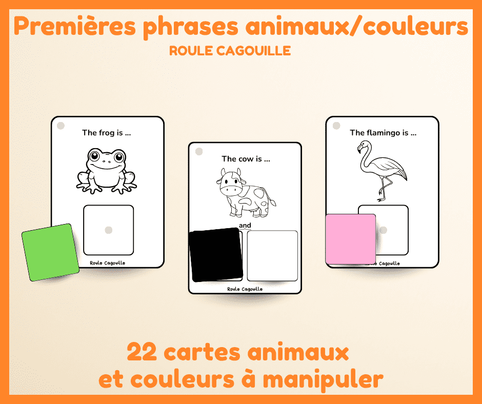 Avec ces cartes couleurs, l’enfant complète des phrases simples comme “The flamingo is pink” en associant le bon mot au bon endroit.