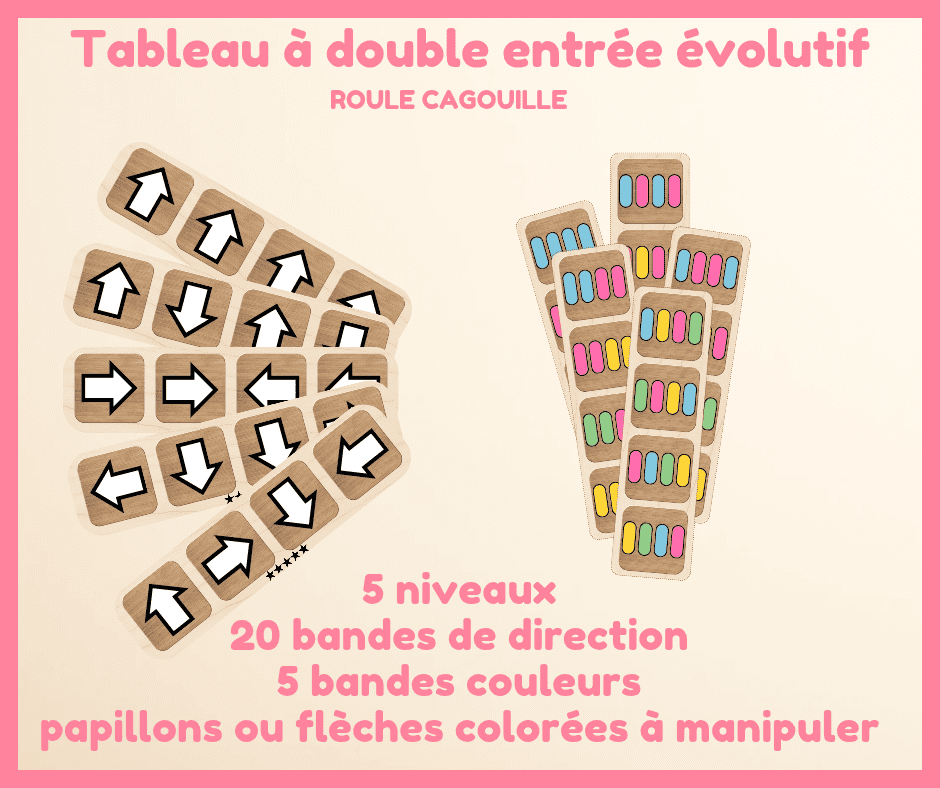 Ce support propose un tableau à double entrée 4x4 (16 cases) permettant à l’enfant de croiser des informations visuelles grâce à des bandes de directions et des repères de couleurs.